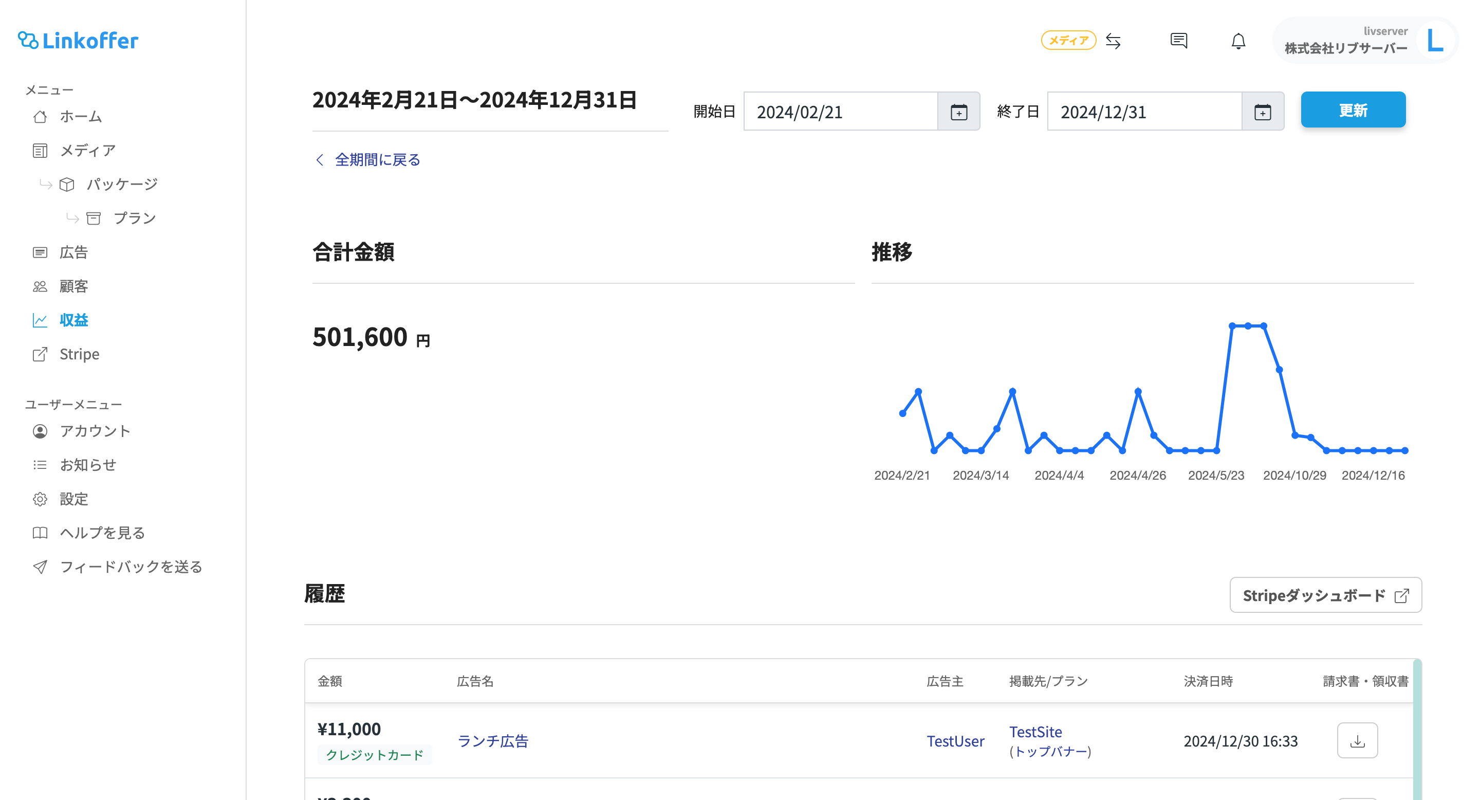複雑な決済や収益などを期間別・メディア別・プラン別・広告主別で分かりやすく管理。収益推移もグラフ表示なので一目でわかります。